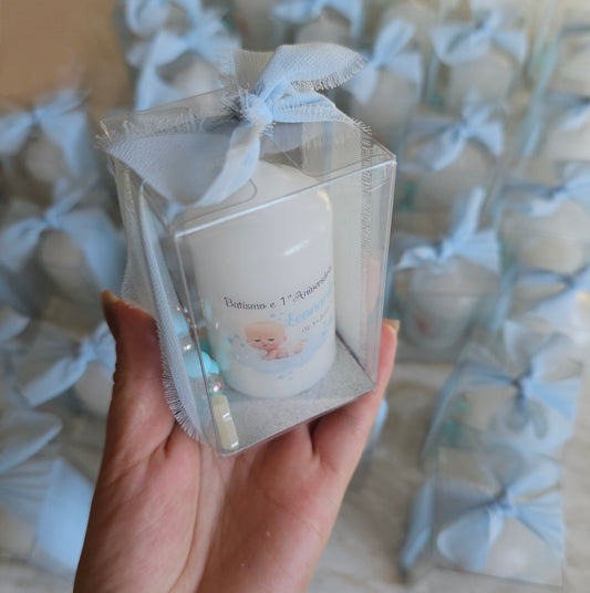 Vela personalizada em caixa transparente