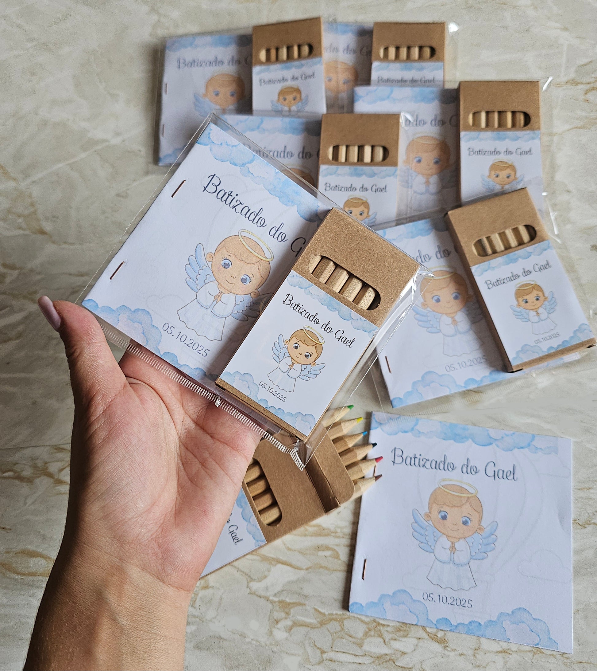 Caixa de 6 lápis coloridos personalizada com livro com desenhos variados para colorir.