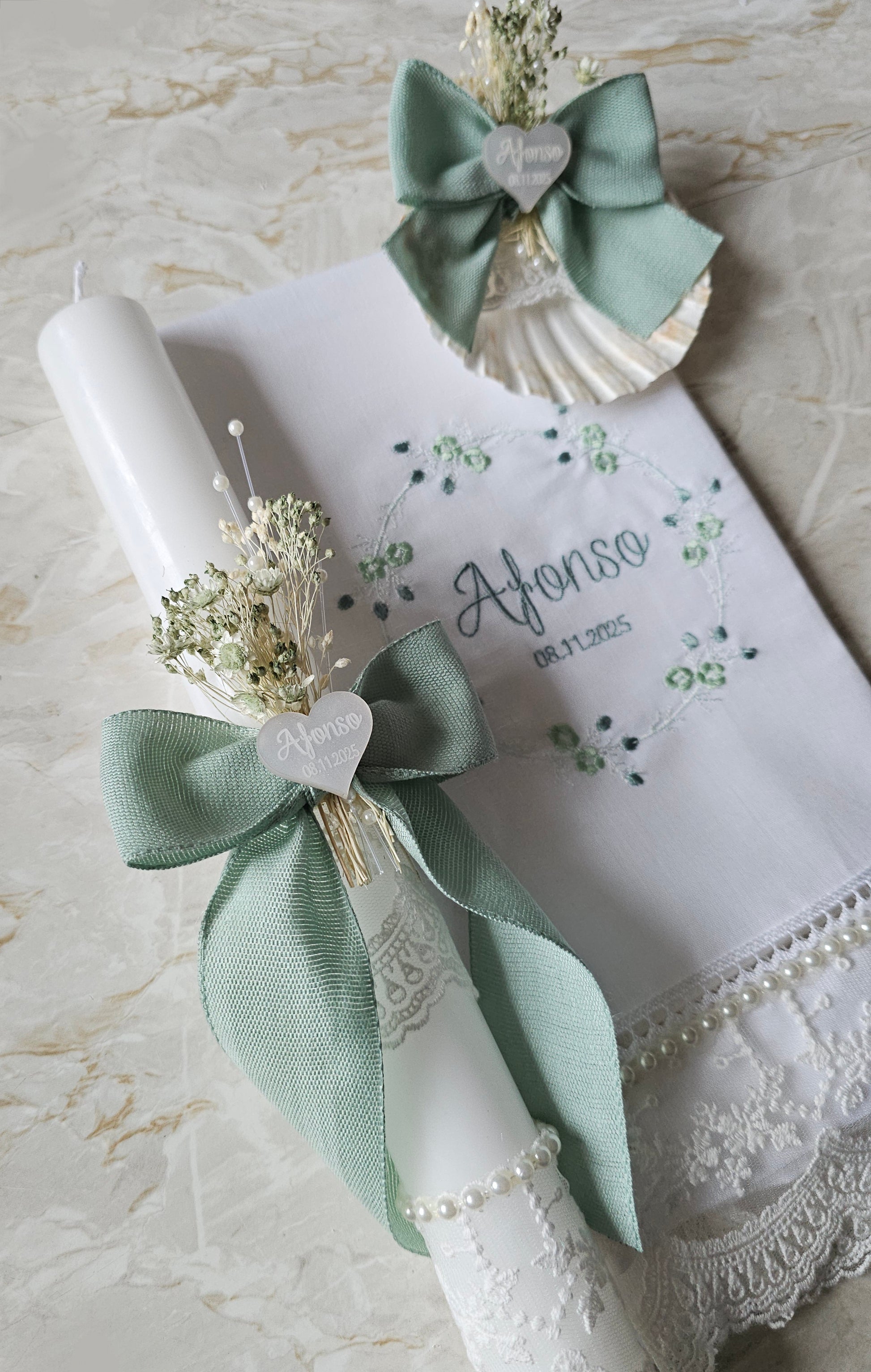 Conjunto de batismo personalizado em tons de verde e branco com flores preservadas, renda e aplicações em acrílico madrepérola branco com gravação.
