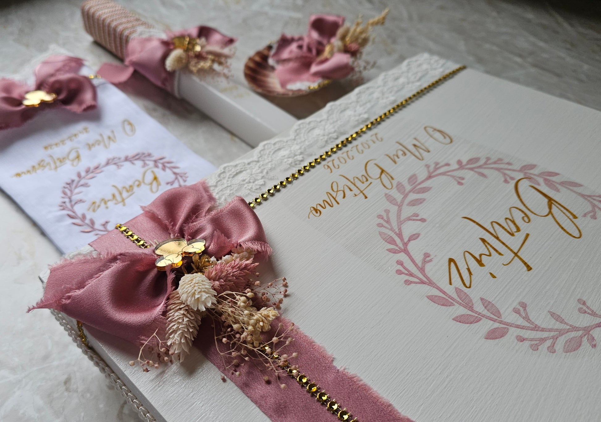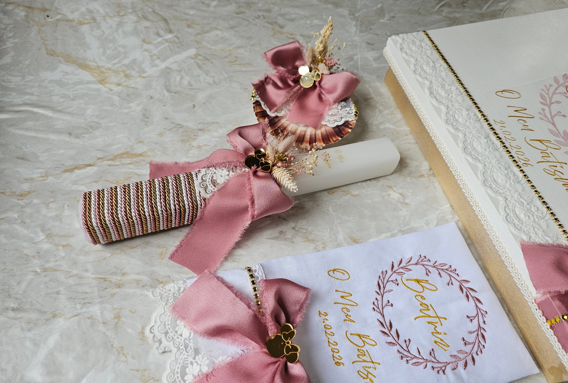 Conjunto de Batismo personalizado no tema minnie com aplicações em acrílico dourado espelhado, flores preservadas e fita chiffon rosa velho vivo.