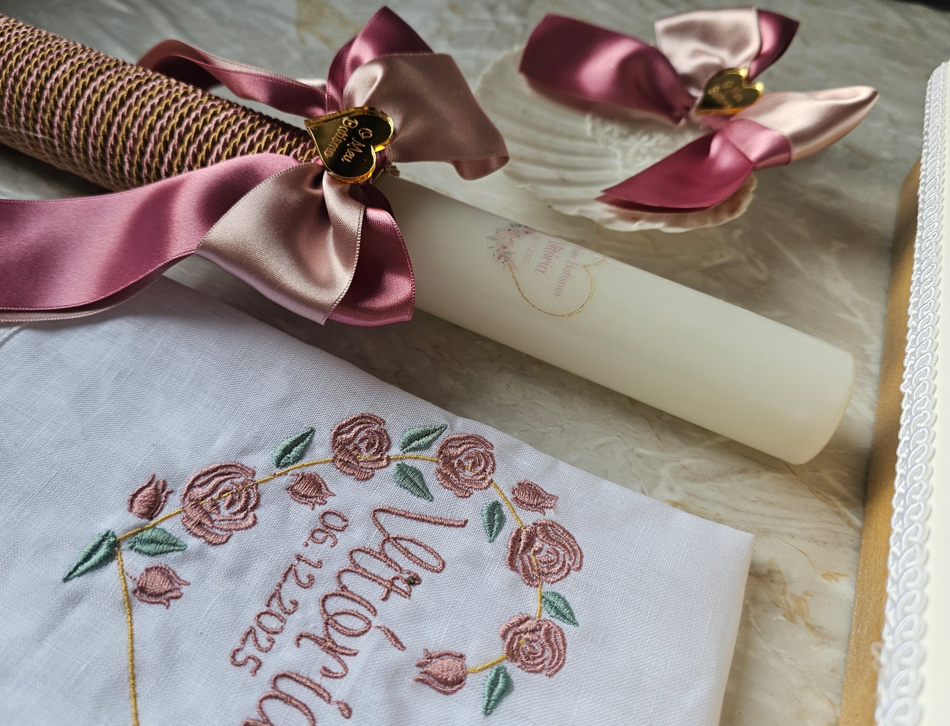 Conjunto de Batismo personalizado com o tema floral e corações em acrílico dourado espelhado.