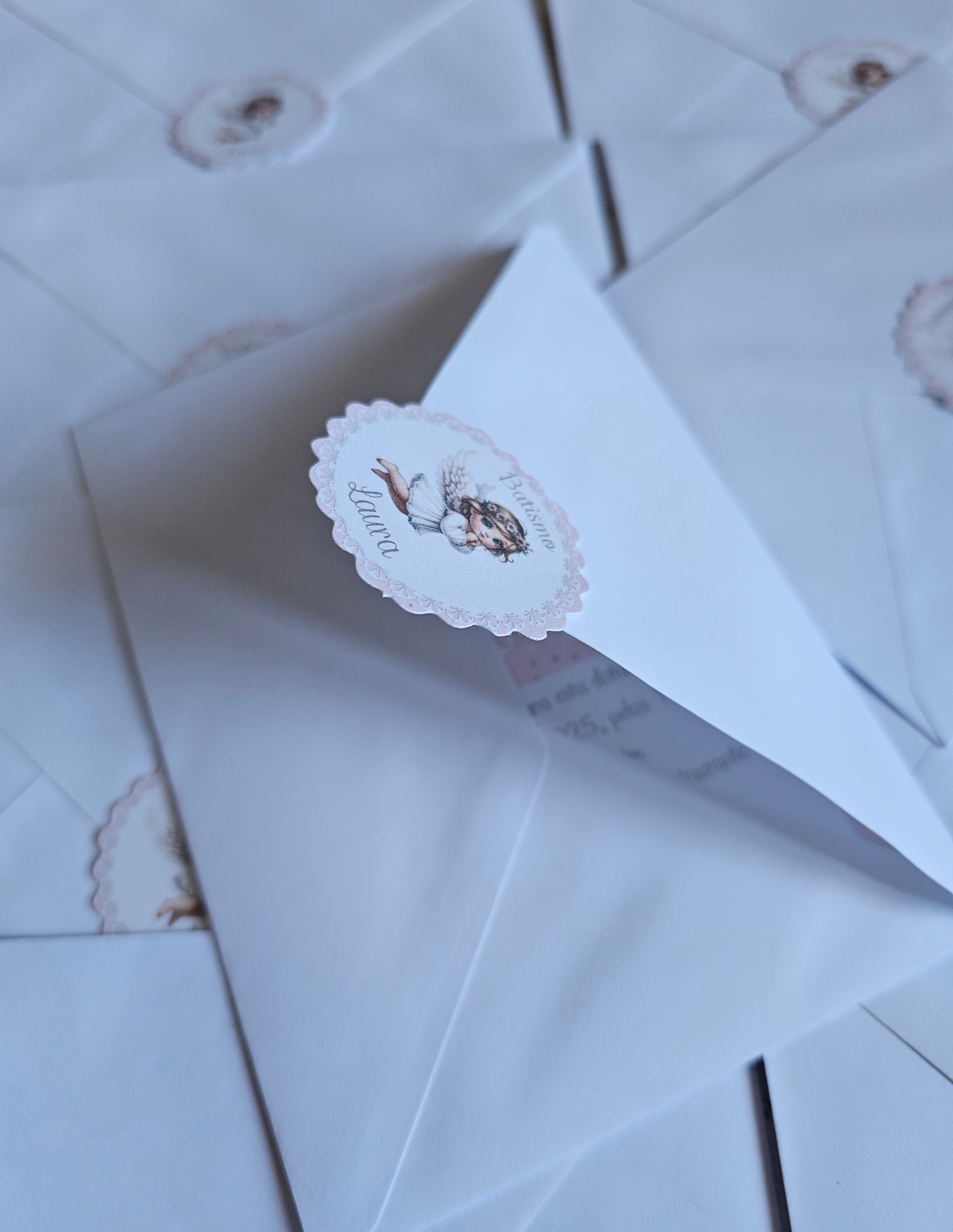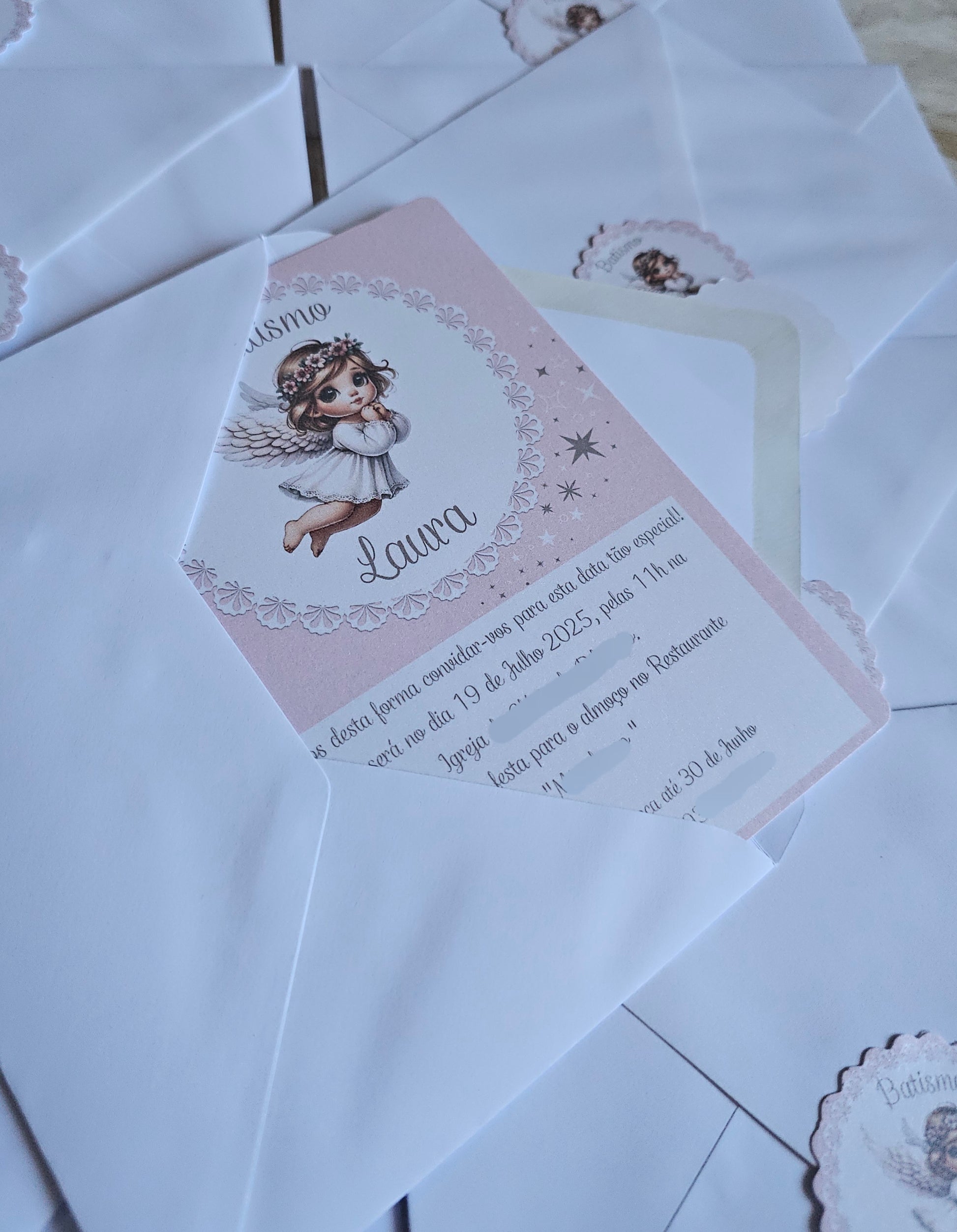 Convites em papel metalizado 250gr, com envelope branco básico e rótulo.