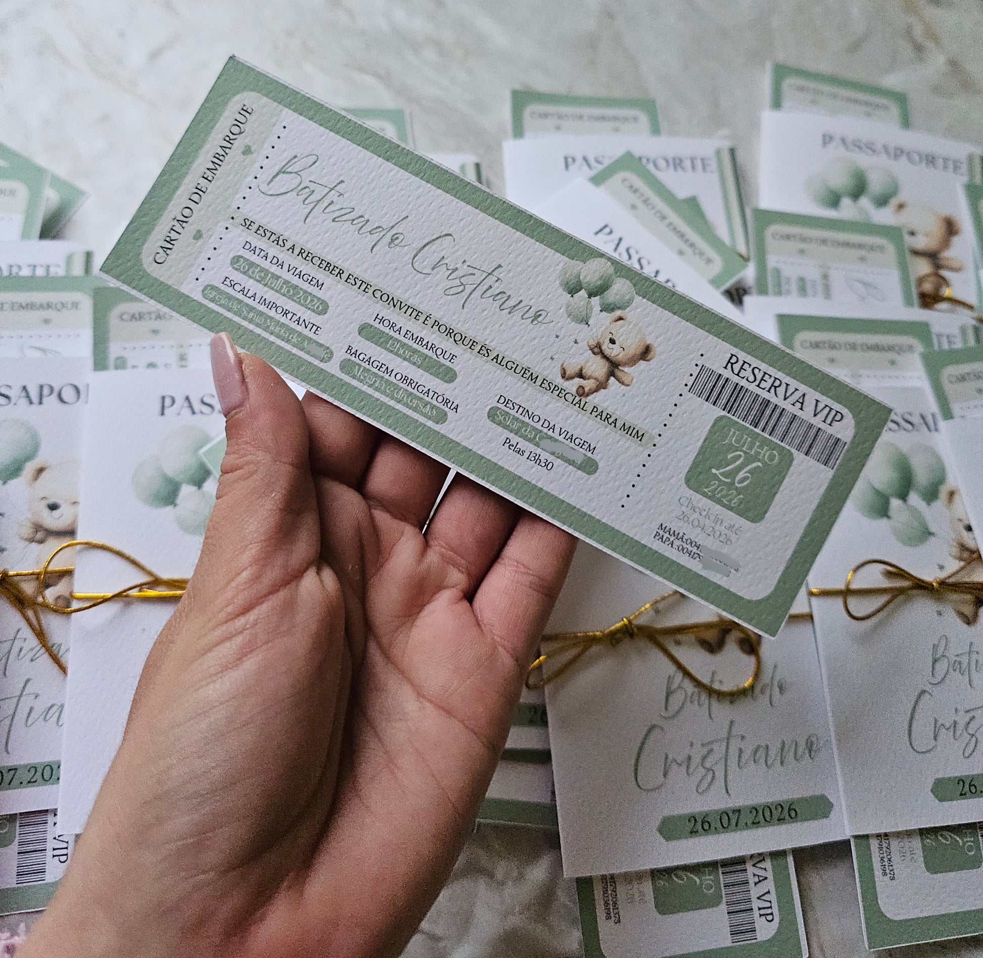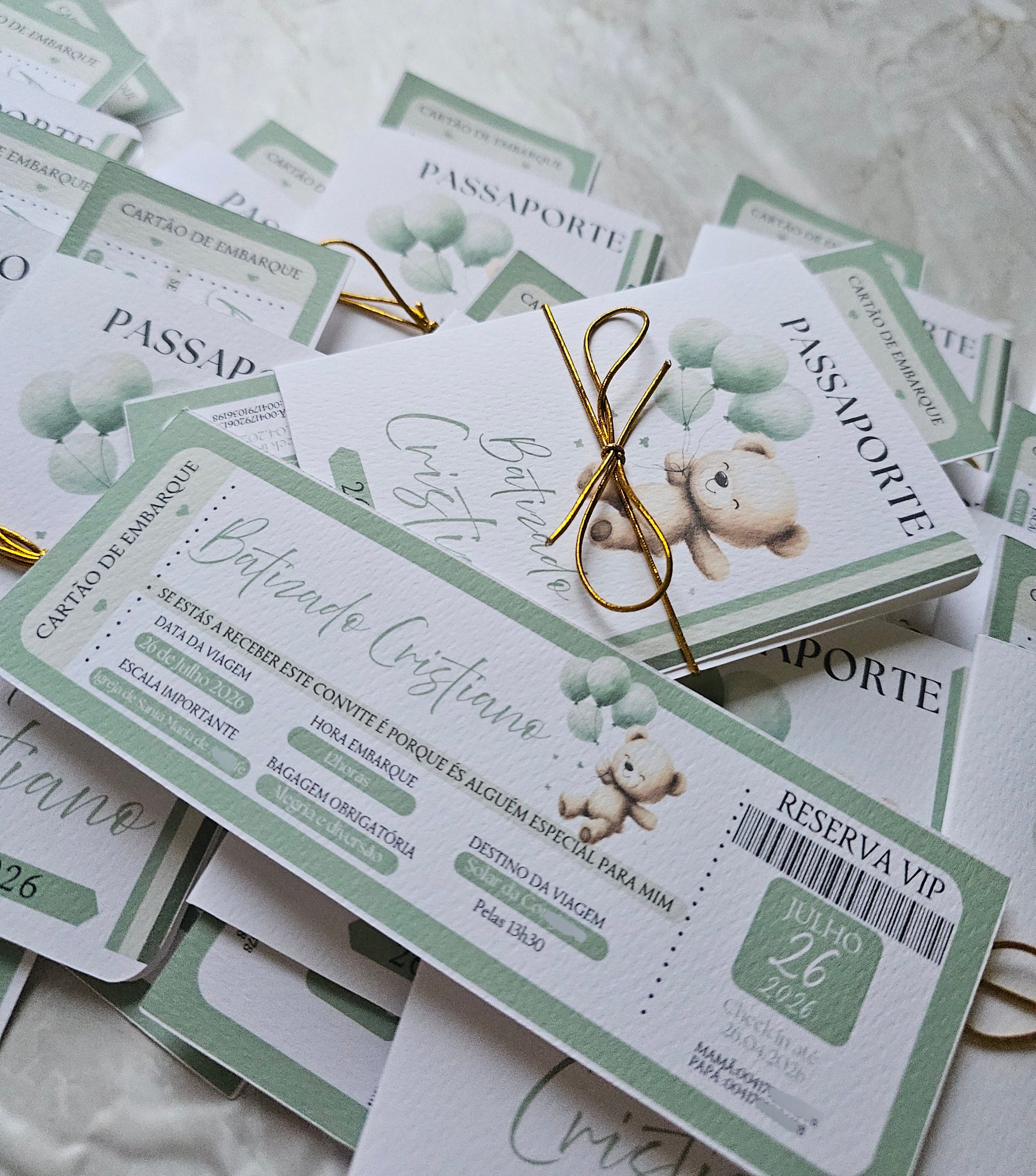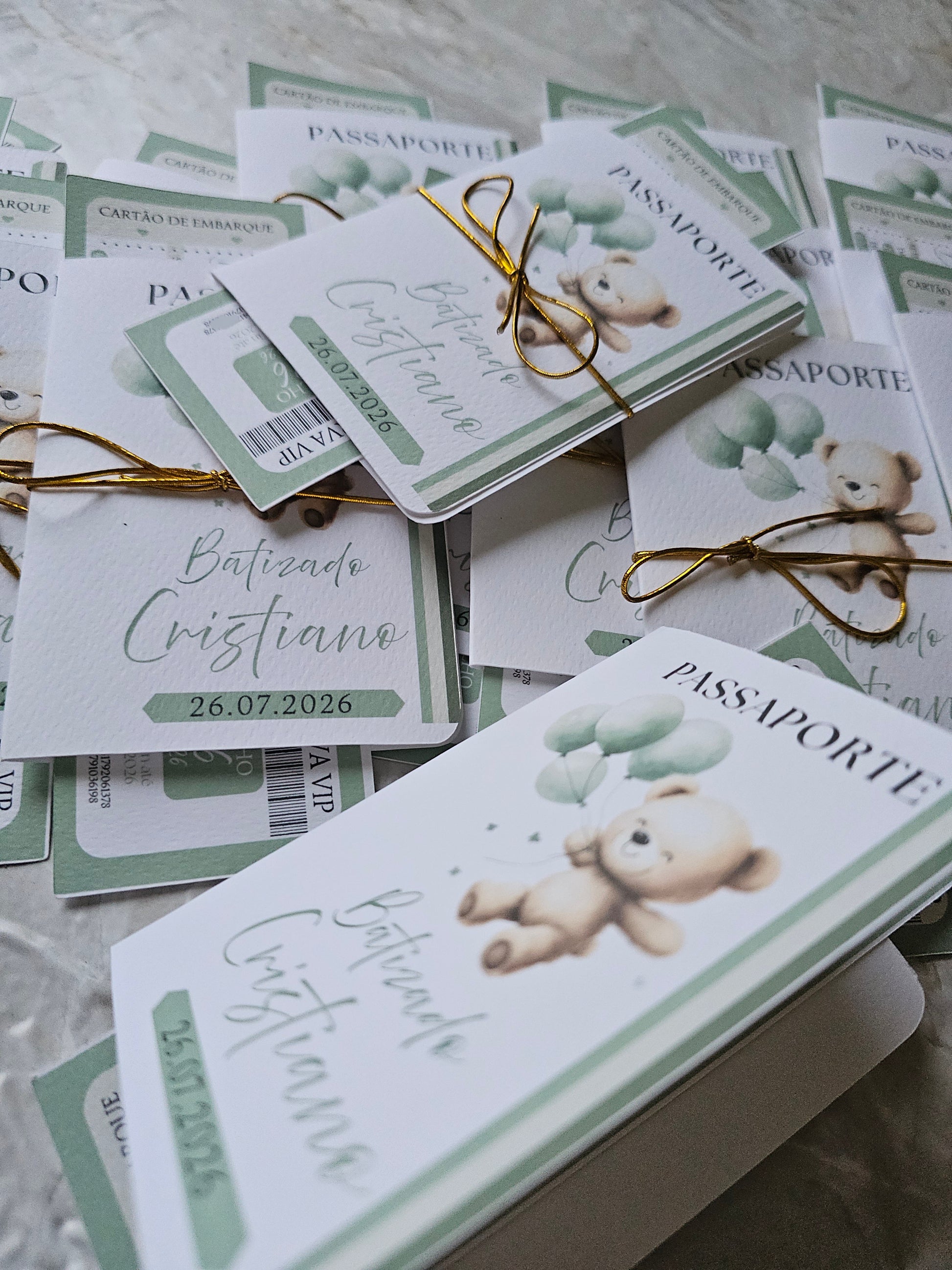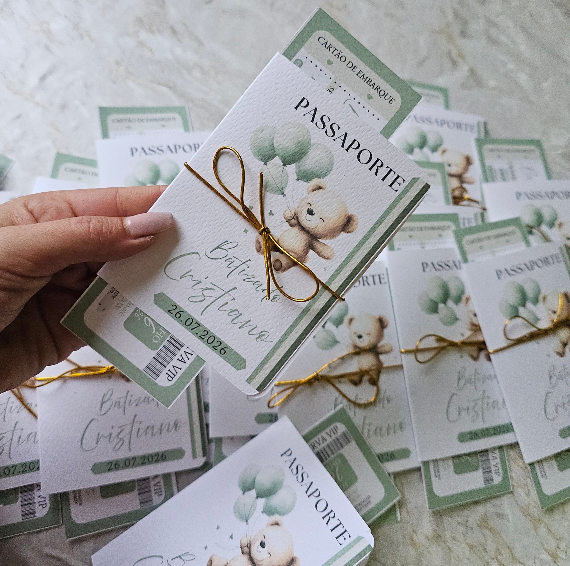 Convite formato passaporte com cartão de embarque no tema ursinho em tons de verde.