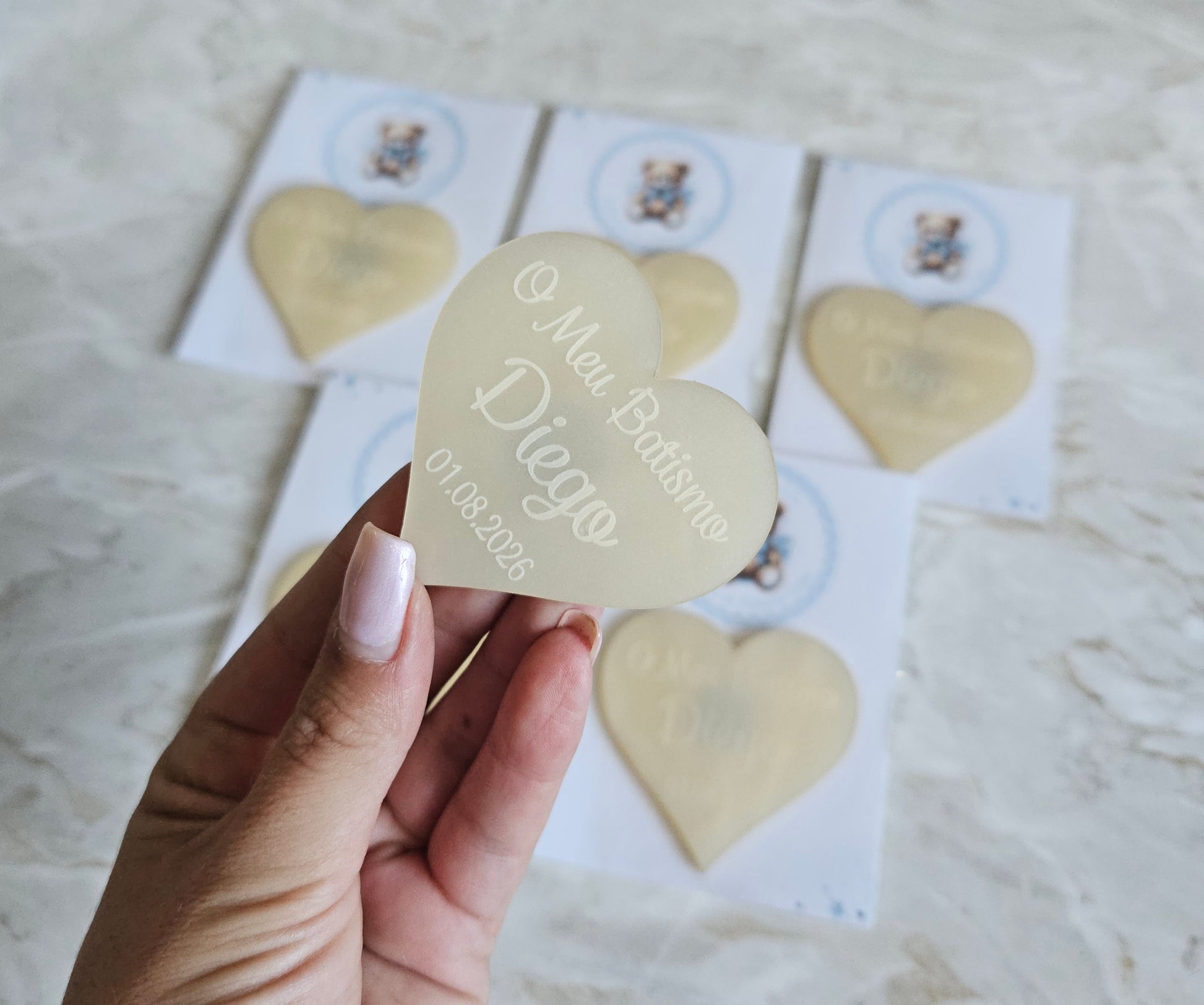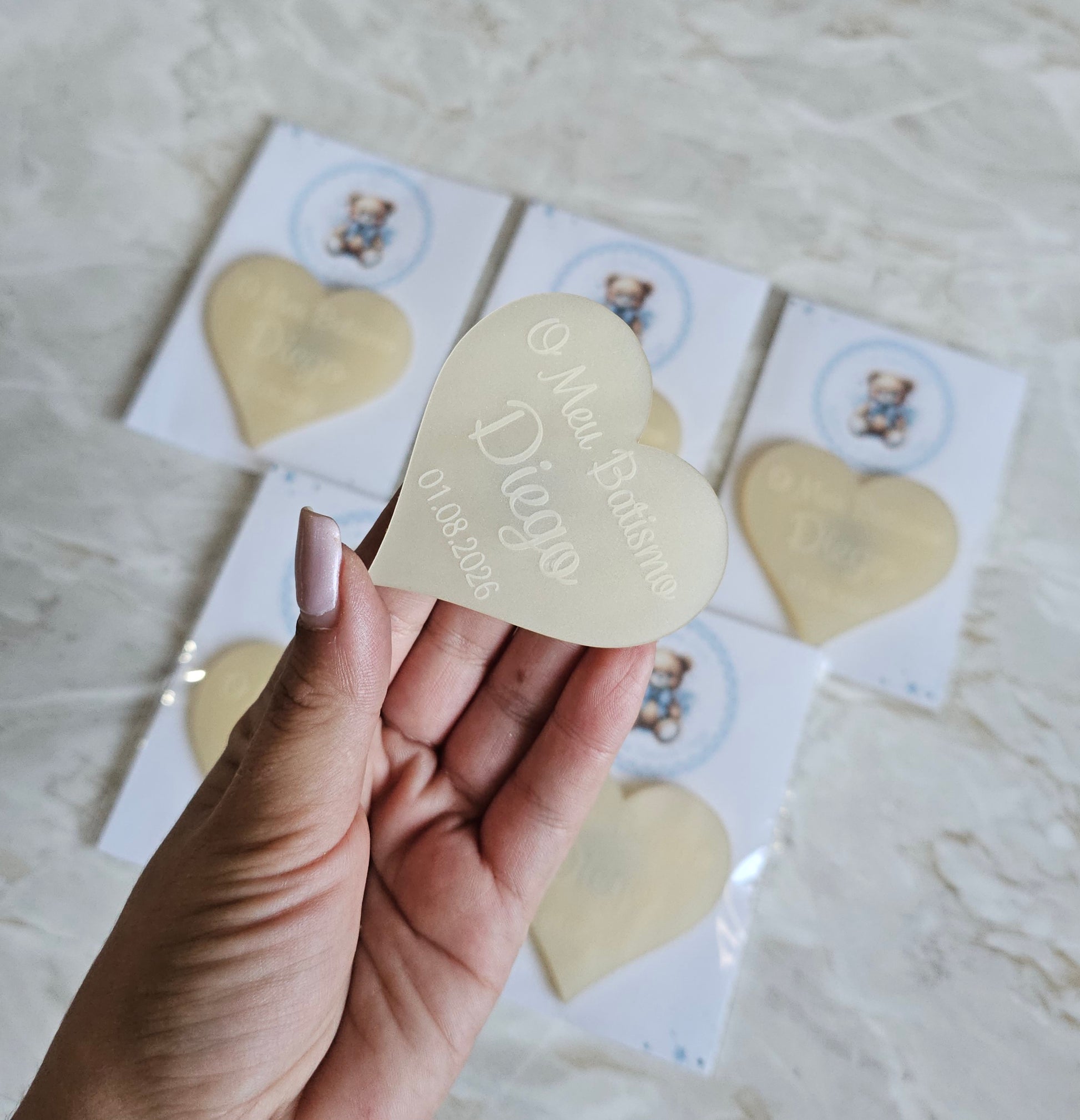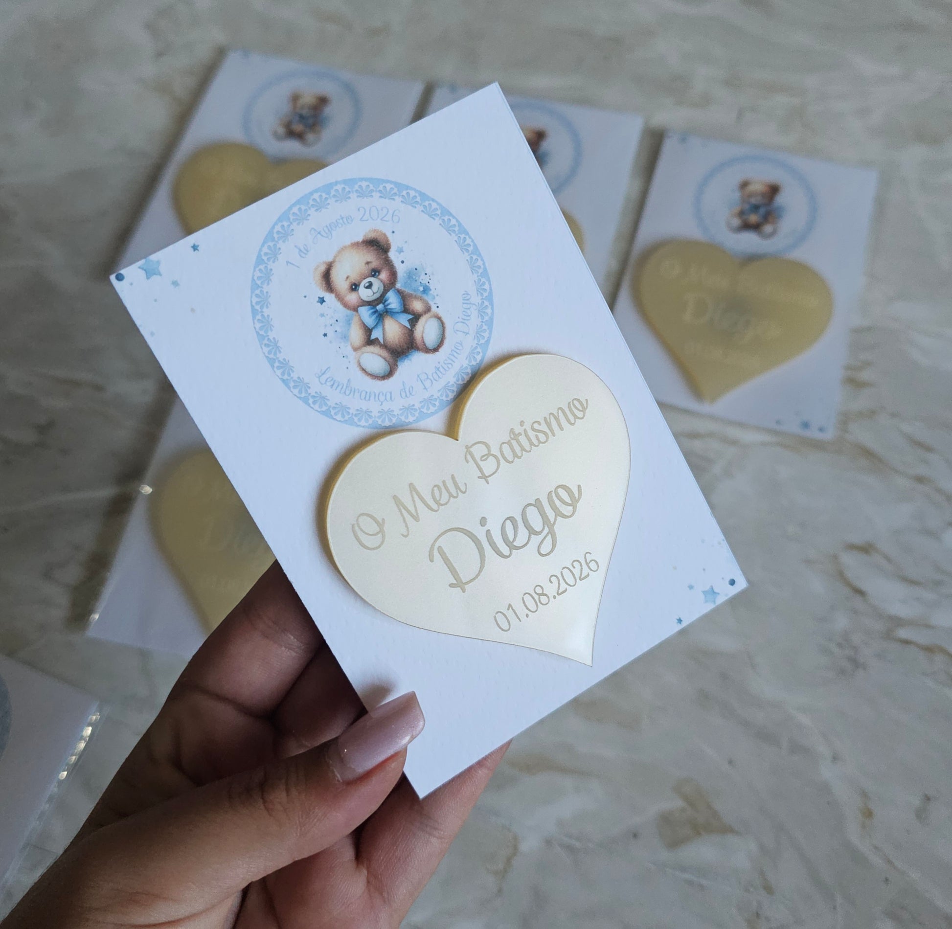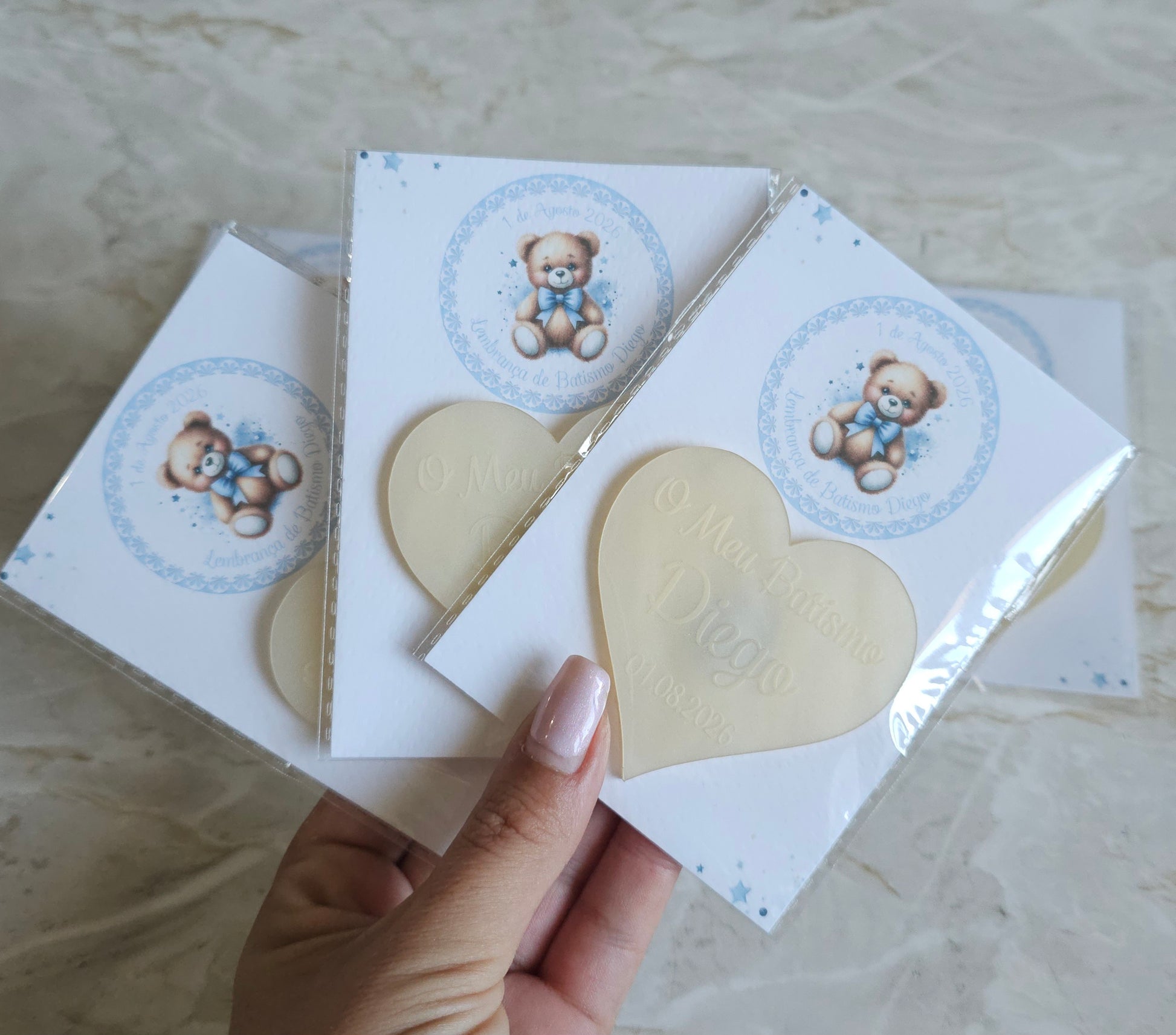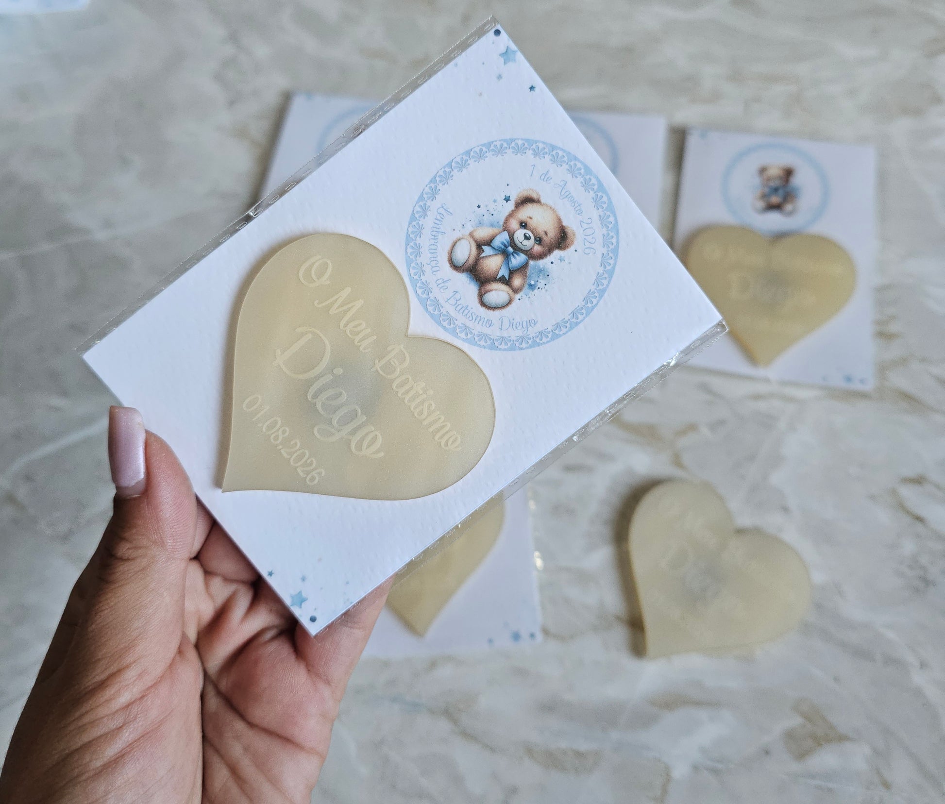 Íman personalizado em acrílico madrepérola creme com cartão personalizado no tema ursinho azul.
