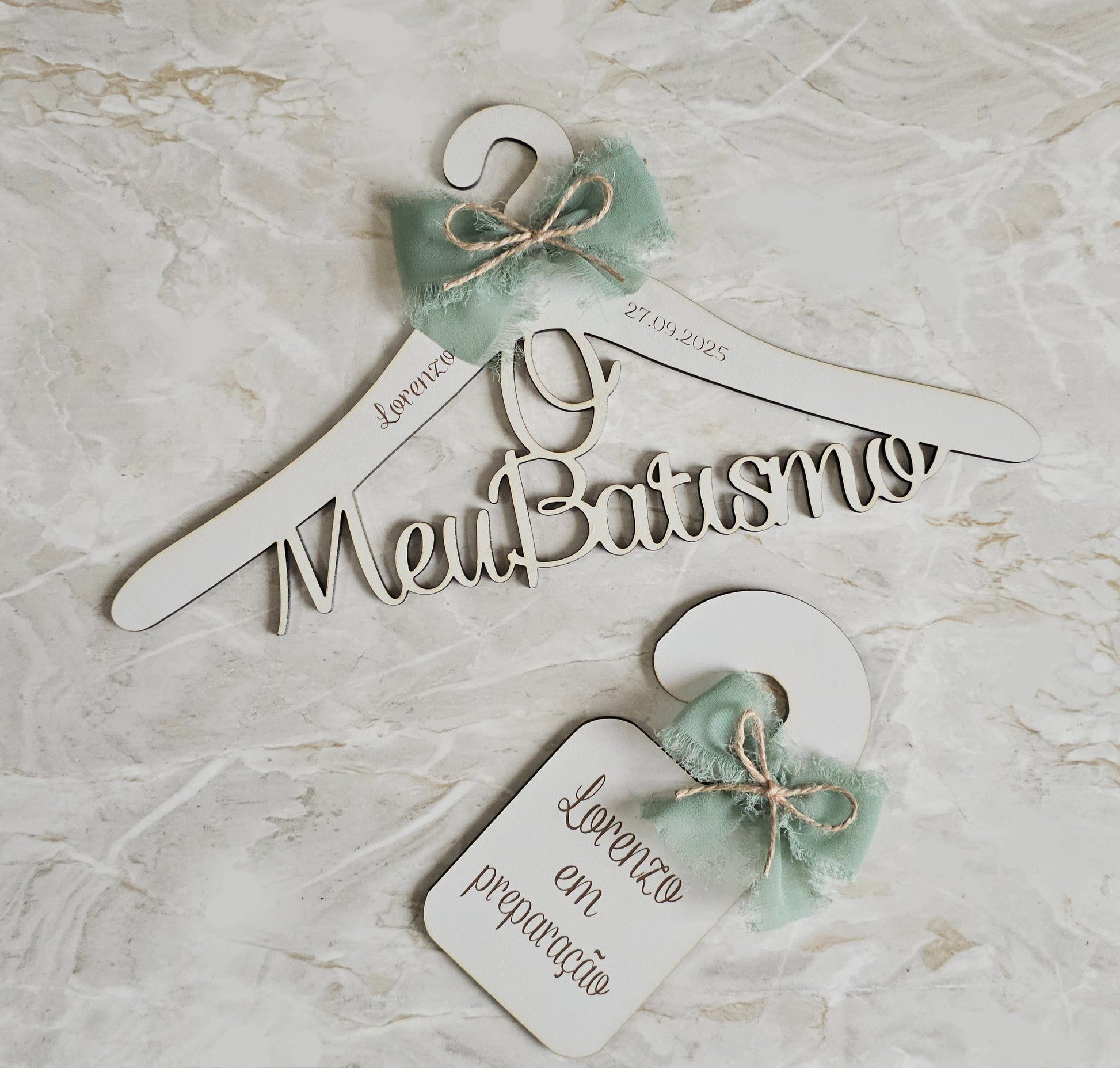 Kit de cabide personalizado com gravação de nome + data com aplicação fita chiffon (várias cores disponíveis)