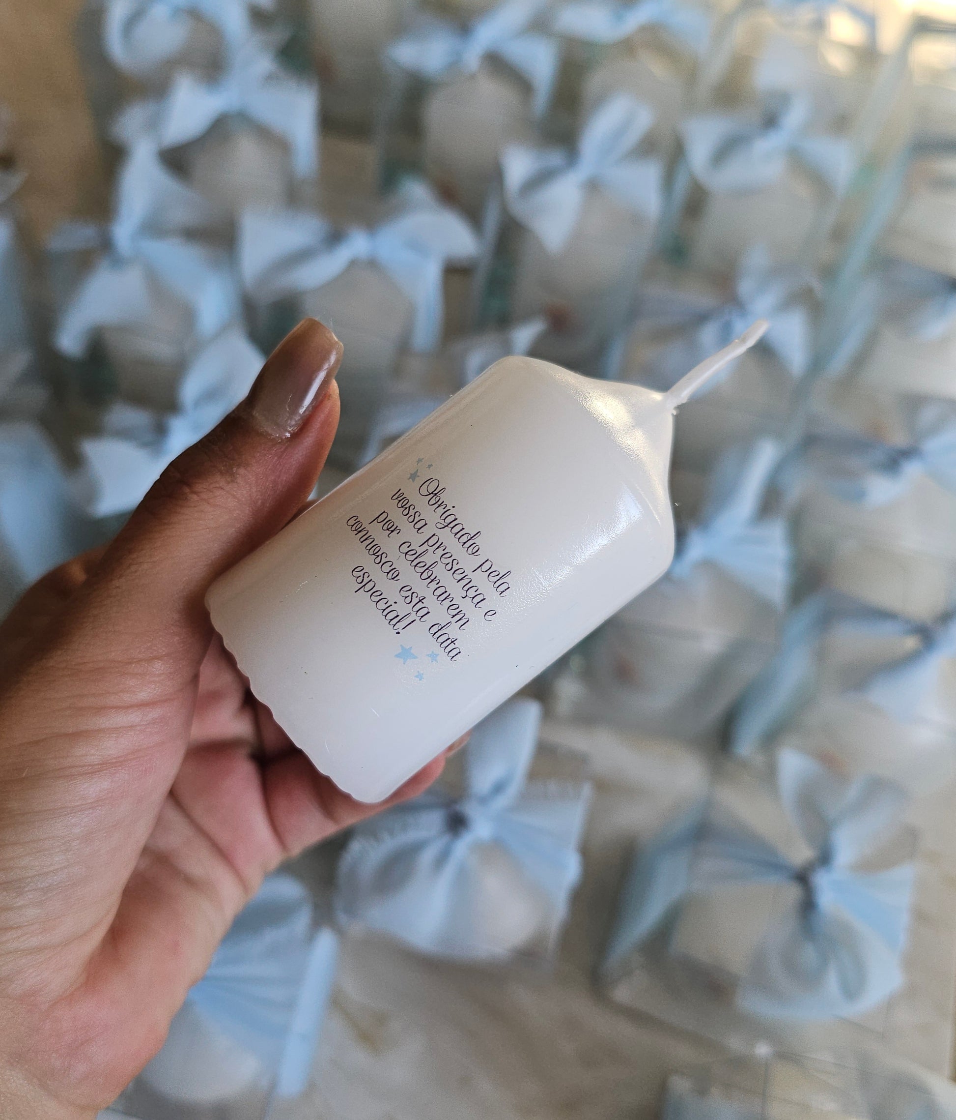 Vela personalizada em caixa de acetato transparente, tema baby boss com agradecimento na parte de trás, mini dezena em tons de azul e laço em fita chiffon azul.